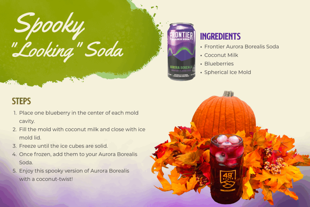Celebrate this Halloween with the Mysterious Aurora Borealis from Frontier Alaska Soda accented with frozen “eyeballs” that add a coconut cream flavor and blueberries for that extra touch of Alaska.